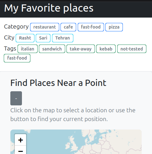 فضاهای مورد علاقه من، پروژه ای است که در آن رستورانها و کافههای مورد علاقهام را لیست میکنم و به آنها بر اساس معیارهای مختلفی امتیاز میدهم. هر فضا بر روی نقشه مشخص شده و امکان آن را دارد که بر اساس موقعیت کاربر فضاهای اطراف او را روی نقشه نشان دهد.